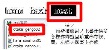 | (1)「next」ボタンにリンクを貼ります。 (2)その他、「horibe_yahei01」「hara_soemon01」「otaka_gengo02」にもリンクを貼る。 | |||||||||||||||||||||||||||