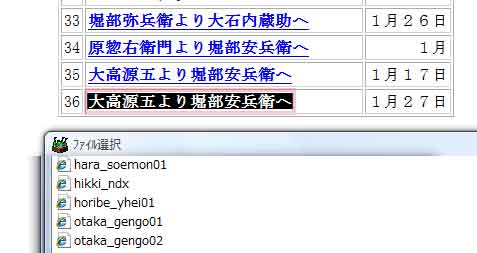 | (1)目次のファイル名を、「hikki_ndx」とします。 (2)「35 大高源五より堀部安兵衛へ」のファイル名を「otaka_gengo01」とします。 (3)分業・協業・情報処理の場合、情報の共有が前提で、フォルダ・ファイルを統一しなくてはいけません。 | |||||||||||||||||||||||||||