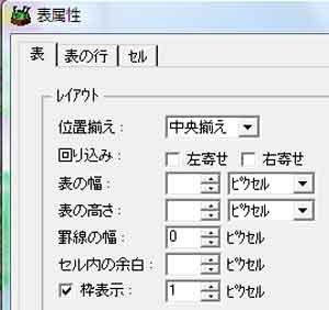 | 写真(2)は、「表属性の変更」画面です。 (1)「枠表示」にチェックを入れ、「ピクセル」は「1」です。 (2)「罫線の幅」は「0」ピクセルとします。 |