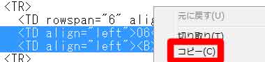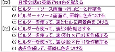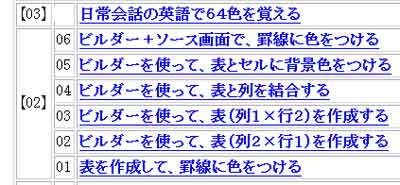 | <TR> <TD rowspan="6" align="left">【02】</TD> @(Enterキーを押して、1行空白行をつくる)←ここへ貼り付け <TD align="left">06</TD> <TD><B><A href="02/06.htm">ビルダー+ソース画面で、罫線に色をつける</A></B></TD></TR> |