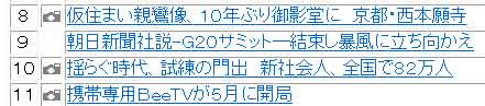 | <TR> <TD align="center">8</TD> <TD align="center">@<IMG src="../../../btn/camera.gif" height="10" width="16"></TD> <TD align="left"><A href="08.htm">仮住まい親鸞像、10年ぶり御影堂に</A></TD></TR> <TR> <TD align="center">9</TD> <TD align="center"></TD> <TD align="left"><A href="09.htm">朝日新聞社説-結束し暴風に立ち向かえ</A></TD></TR> <TR> <TD align="center">10</TD> <TD align="center">@<IMG src="../../../btn/camera.gif" height="10" width="16"></TD> <TD align="left"><A href="10.htm">試練の門出 新社会人、全国で82万人</A></TD></TR> <TR> <TD align="center">11</TD> <TD align="center">@<IMG src="../../../btn/camera.gif" height="10" width="16"></TD> <TD align="left"><A href="11.htm">携帯専用BeeTVが5月に開局</A></TD></TR> |