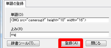 | 写真(5)は、単語登録の実行です。 (1)「単語」に<IMG src="camera.gif" height="10" width="16">を貼り付けます。 (2)「よみ」は日本語入力にして「mg」(imegeの略)を入力→「登録」 |