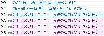 | <TR> <TD align="center">22</TD> <TD align="center">@mg</TD> <TD><A href="22.htm">忠臣蔵の魅力DVDに 元高校教諭が制作(朝日新聞)</A></TD></TR> |