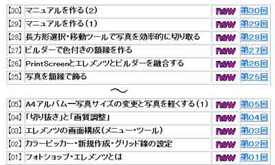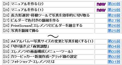 height="22" width="54"> <HEAD> <TABLE border="1"> <TR> <TD align="left">【30】</TD> <TD align="left"><B>マニュアルを作る(2)</B></TD> <TD align="left">A<IMG src="btn/new05.jpg" height="22" width="54"></TD> <TD align="right"><B><A href="30.htm" target="_blank">第30回</A></B></TD></TR> <TR> <TD align="left">【29】</TD> <TD align="left"><B>マニュアルを作る(1)</B></TD> <TD align="left">A<IMG src="btn/new05.jpg" height="22" width="54"></TD> <TD align="right"><B><A href="29.htm" target="_blank">第29回</A></B></TD></TR> <TR> <TD align="left">【28】</TD> <TD align="left"><B>長方形選択・移動ツールで写真を効率的に切り取る</B></TD> <TD align="left"> </TD> <TD align="right"><B><A href="28.htm" target="_blank">第28回</A></B></TD></TR> <TR> <TD align="left">【27】</TD> <TD align="left"><B>ビルダーで色付きの額縁を作る</B></TD> <TD align="left"> </TD> <TD align="right"><B><A href="27.htm" target="_blank">第27回</A></B></TD></TR> |
