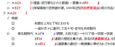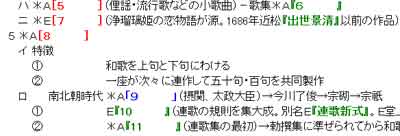 | <TR> <TD colspan="4" align="left">*A<B><FONT color="red">[5 ]</FONT></B>(俚謡・流行歌などの小歌曲)−歌集*A<B>@<FONT color="#ff0000">『6 』</FONT></B></TD></TR> <TD colspan="4" align="left">*E<B><FONT color="red">[7 ]</FONT></B>(浄瑠璃姫の恋物語が源。1686年近松<B><FONT color="#ff0000">『出世景清』</FONT></B>以前の作品)</TD></TR> <TD colspan="5" align="left">*A<B><FONT color="red">[8 ]</FONT></B></TD></TR> <TD align="left">南北朝時代</TD> <TD align="left">*A<B><FONT color="blue">「9 」</FONT></B>(摂関、太政大臣)→今川了俊→宗砌→宗祇</TD></TR> <TD align="left">E<B><FONT color="#ff0000">『10 』</FONT></B>(連歌の規則を集大成。別名E<B><FONT color="#ff0000">『連歌新式』</FONT></B>。E堂上連歌確立)</TD></TR> <TD align="left">*A<B><FONT color="#ff0000">『11 』</FONT></B>(連歌集の最初)→勅撰集に準ぜられてから和歌と対等の地位</TD></TR> |