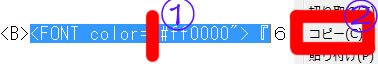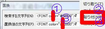 | 写真(2)は、写真(1)のソース画面です。 (1)@「<FONT color="#ff0000">『 」をコピーして、置換に貼り付けます。 |