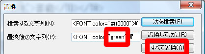| 写真(6)は、すべて置換です。 (1)置換後の文字列を「"#ff0000"」から「"green"」に変更 (2)「すべて置換」をクリック (3)「上書き保存」→ソース画面を閉じる (4)ブラウザ画面上で「更新」 |
