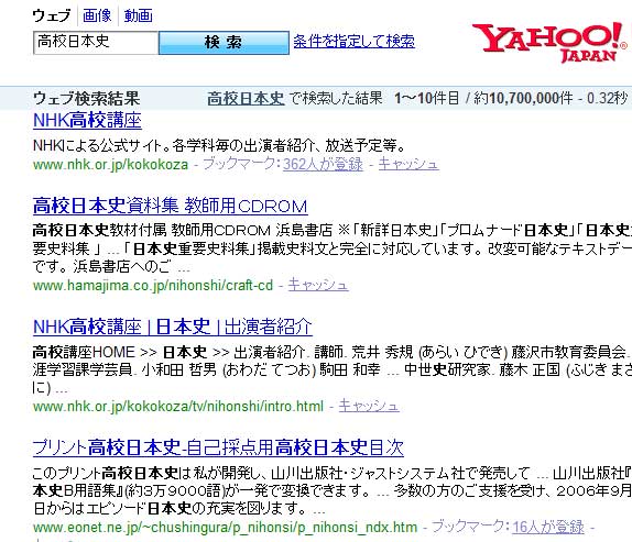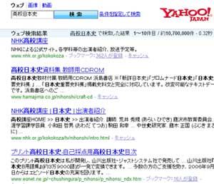| 写真(8)は、ヤフージャパンの検索エンジン画面です。 (1)「高校日本史」と入力し、「検索」をクリックします(2009年5月14日現在)。 (2)1,070万件の内、私の「プリント高校日本史(自己採点用高校史)」は4番目にランクされています。 (3)上位の1番目と3番目がNHKです。2番目が浜島書店です。上位3位までは、企業です。 (4)項目・人名・作品名の色分けが好評です。情報処理ソフトとしてのビルダー3の威力・魅力です。 |