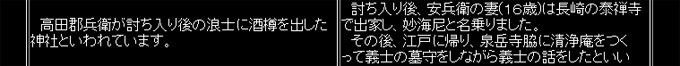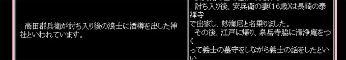 A<TD align="left" width="350"> 高田郡兵衛が討ち入り後の浪士に酒樽を出した神社といわれています。<BR>