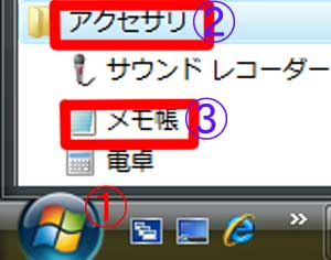 (1)@「スタート」→A「アクセサリー」→B「メモ帳」 |