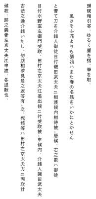 (1)浅野内匠頭の辞世「風さそふ花よりも猶我ハまた春の名残をいかにとかせん」の当時の史料です。