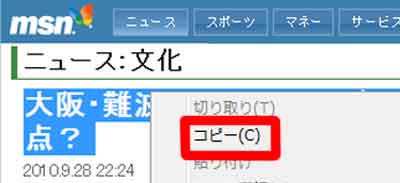 | (1)ネット(サイト)上の見出しをドラッグ→右クリック→「コピー」 |