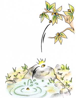 秋になってその実がうれて落ち出しました。はじめ、ぽろっと一つ技から離れて、下の岩にかちんとあたって、池の中へどぶんと飛びこみました。