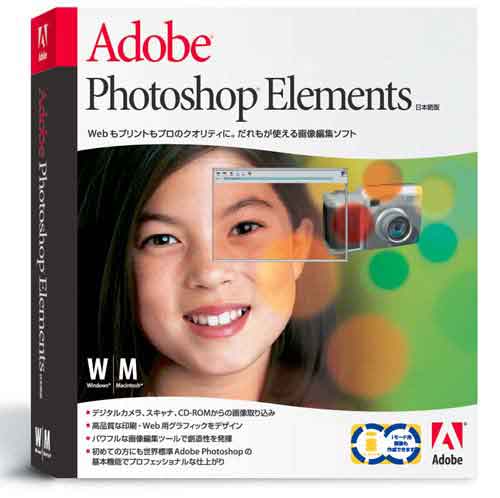 Photoshop Elementsです。 (1)Adobe Photoshop Elements(アドビ・フォトショップ・エレメンツ)は、アドビ社の製品です。 (2)アドビ社は、正式名をアドビシステムズ (Adobe Systems)といい、本社はカリフォルニア州サンノゼ市にあります。 (3)プロが使用するAdobe Photoshop、Adobe Illustrator、Adobe Premiere、Adobe Flashなどをソフトを製造・販売しています。 (4)アドビ・フォトショップ・エレメンツは、プロが使用するアドビ・フォトショップのエレメンツ(原論)版、つまり入門編ということでしょうか。プロが使う多機能の中から、基本的な機能のみを集めた製品です。 |