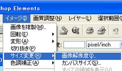 | 写真(1)は、「サイズ変更」のメニューです。 (1)エレメンツの「イメージ」→「サイズ変更」→「画像解像度」をクリックします。 | ||||||||||||||||||