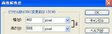 | 写真(2)は、「画像解像度」の小ウインドウです。 (1)高さを「500」とすると、自動的に幅は「463」となります。 (2)高さを「756」から「500」に変更すると、ピクセル数(重さ)も「1.51M」(151万バイト)から「678K」(64万1キロバイト)に軽くなっています。 | ||||||||||||||||||