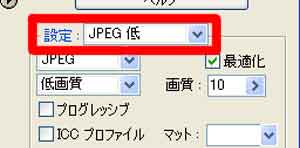| 写真(4)は、「Web用に保存」の初期設定画面です。 (1)「設定」は「JPEG低」を選択します。 | ||||||||||||||||||