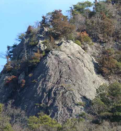 磐座神社と権現 権現山と天狗岩 (兵庫県相生市) おそらく、初期の信仰の対象は権現山の天狗岩だったと思われます。今も、天狗岩は、矢野のどの位置からも見渡せる象徴的な存在です。龍王山から権現山へは、時間は約5分ですが、急勾配だし、左右は断崖絶壁です。信仰心と苦行が一致していた時代には、多くの人が参拝したでしょう。 古老の話では、「朝な夕なに、神が降りたという天狗岩を拝んでいた」ということです。 権現とは、人々を救うために、阿弥陀・菩薩(仏)が権」(仮)に日本の神に姿をかえて「現」れるという神仏混淆の考えです。 沖ノ島の沖津宮の初期と比較すると、同じ形態であることが分ります。 | ||