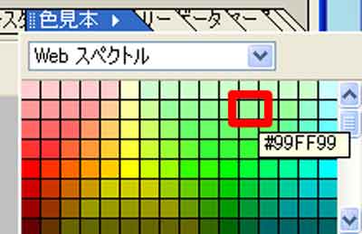 | 写真(2)は、エレメンツ上の好みの色をクリックした画面です。 (1)「色見本」をクリックし、▼をクリックして、「Webスペクトル」を選択します。729色選べます。 (2)好みの色をクリックします。「#99FF99」というカラーコードをメモします。 (3)「Webスペクトル」は、エレメンツ1.0にはありません。エレメンツ2.0から装備されています。 |