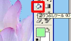 | 写真(3)は、「#99FF99」の色を表示させ、「塗りつぶしツール」を選択した画面です。 |