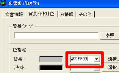 | 写真(5)は、ビルダーの「文書プロパティ」の「背景」にカラーコード「#99FF99」を入力していす。 (1)ビルダーの「編集」→「文書のプロパティ」→「背景/テキスト色」をクリックします。 (2)「背景」の右の空欄にカラーコード「#99FF99」を入力し、「OK」をクリックします。 |