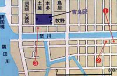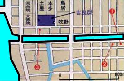 | 写真(6)は、吉良邸屋敷図の完成版です。 (1)海と川で「レイヤー1」、屋敷図で「レイヤー2」、文字で「レイヤー3」を使います。 (2)最後に、「レイヤー」→「画像を統合」して、保存します。 (3)微妙で複雑な罫線は、トレーシングペーパーを使った方がよい場合があります。 |
