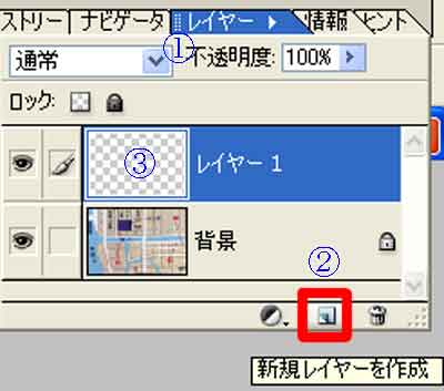 | 写真(2)は、「新規レイヤーを作成」しています。 (1)「@レイヤー」→「A新規レイヤーを作成」→「Bレイヤー1」が作成されました。 (2)「レイヤー1」に境界線を引いていきます。 |
