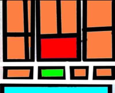 | 写真(5)は、屋敷に「塗りつぶしツール」で色を付けました。 (1)「@レイヤー」→「A新規レイヤーを作成」→「Bレイヤー2」が作成されました。 (2)「レイヤー2」に境界線を引いて、屋敷に色を付けます。 |
