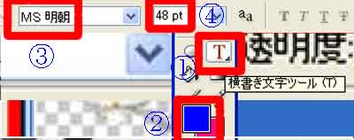 | 写真(2)は、文字入力の設定画面です。 (1)「横書き文字ツール」を選択します(@)。「縦書き文字ツール」をあります。 (2)文字の「描画色」を選択します(A)。 (3)書体を選択します(B)。 (4)文字サイズを選択します(C)。 |