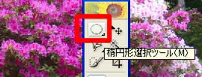| 写真(2)は、楕円形にする写真をドラッグし、「移動ツール」を選択しています。 (1)左上から右下へ一気にドラッグすることがポイントです。 |