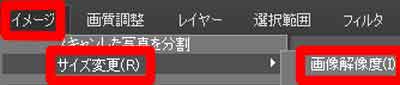 | (2)「イメージ」→「サイズ変更」→「画像解像度」 |