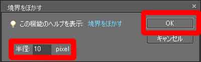 | (1)「半径」の数字が大きいほどボカシが大きな範囲に及びます。 (2)経験則でいうと、「10」が上品な作品になります。 |