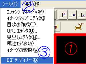 | 写真(1)は、「ロゴデザイナー」画面です。 (1)@は取り込まれたパージの背景色→A「ツール」→B「ロゴデザイナー」 |