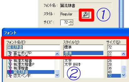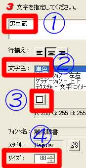 | 写真(3)は、「各種設定」画面です。 (1)@「フォント属性」→Aサイズ・スタイル・フォントを設定→「OK」 |