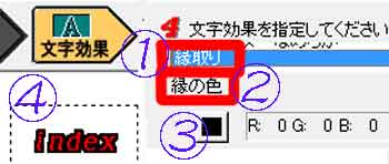 | (1)@「縁取り」→A「縁の色」→B■(黒色)を選択→→C「index」の完成 | |||||