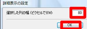 | 写真(4)は、詳細表示の設定画面です。 (1)「選択した列の幅」の初期値(90)を「80」に変更→「OK」 |