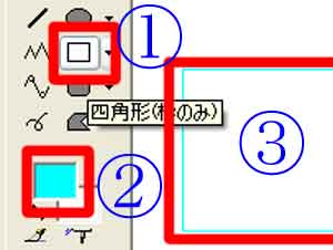 | 写真(2)は、「ボタンの背景色」画面です。 (1)@「四角形(枠のみ)」→A1ページ目と同じ背景色を選択 (2)Bやや大き目に左上から右下へドラッグ |