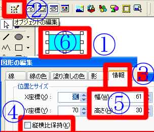 | 写真(4)は、「背景の幅と高さ設定」画面です。 (1)@「背景」をクリック→A「オブジェクトの編集」→B「情報」→C「縦横比保持」オフ→D「幅」(61)・高さ(30)設定→E「幅」(61)・高さ(30)の実行見本 (2)「幅」(61)・高さ(30)は、文字の「幅」(59)・高さ(28)より、2ピクセル大きくしています。 |