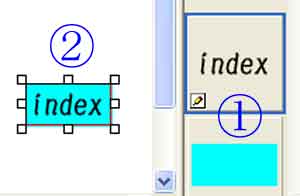 | 写真(6)は、「文字を背景の上にドラッグ」画面です。 (1)@「オブジェクトスタック」で文字(index)を背景の上にドラッグ→A実行見本 |
