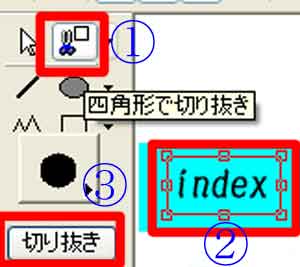| 写真(7)は、「切り抜き」画面です。 (1)@「四角形で切り抜き」→A文字(index)のドラッグ→B「切り抜き」 |