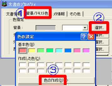 (1)@「背景/テキスト色」→A「選択」→B「色の作成」 |