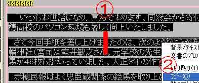| 写真(3)は、「文字列のコピー」画面です。 (1)(B画面)での操作です。 (2)@文字列をドラッグ→右クリック→「コピー」 |
