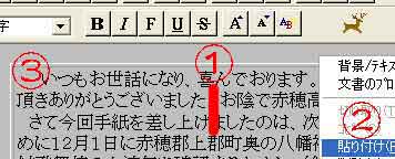 | 写真(4)は、「文字列の貼り付け」画面です。 (1)(A画面)での操作です。 (2)@写真(3)で作成したビルダーのレイアウトの文字を貼り付ける場所を右クリック→A「貼り付け」 (3)B実行画面 |