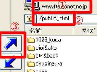 | 写真(7)は、「01ページの1枚目の写真をクリック」画面です。 (1)失敗した場合は@「/public_html」が表示されない (2)アップのA「 |