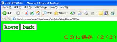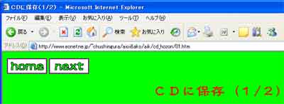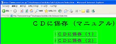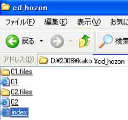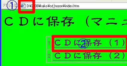 | 写真(1)は、「ファイルの選択」画面です。 (1)「マイコンピュータ」→「ファイル」→「D」ドライブ→「2008」フォルダ→「kako」フォルダ→「cd_hozon」フォルダ (2)「index」ページをダブルクリック(またはシングルクリック) |