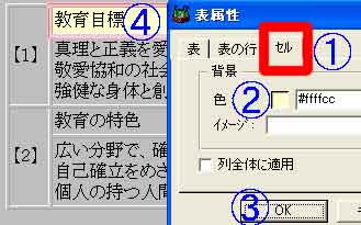 | 写真(6)は、「1ページ目と小目次の完成(6)」画面です。 (1)@「セル」→A「色」は手入力(ここでは「#ffffcc」)→B「OK」→C実行結果 (2)その他のセルにも色をつける→「上書き保存」 | |||||||||||||||||||||||||||||||||||||||||||||||||||||||||||||||