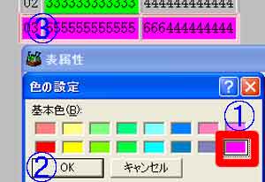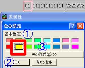 | (1)@48色の基本色から選択→A「OK」→「OK」 (2)B「基本色」以外を選択する場合、「色の作成」 |