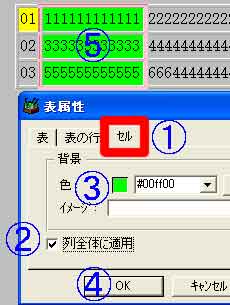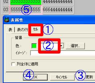 | (1)@「セル」→A「列全体に適用」をオン→B「色」の選択→C「OK」→D実行結果 (2)「イメージ」をクリックすると、ユーザー背景が使用できる |