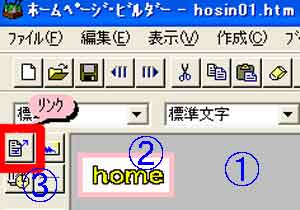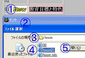 | 写真(4)は、「小目次と1ページ目の相互リンク(4)」画面です。 (1)学校の紹介の1ページ目(hosin01)を開く (2)@1ページ目なので、戻る(back)・進む(next)ボタンは削除する。 (2)A「home」をクリック(ダブルクリックでもよい)→B「開く」 | |||||||||||||||||||||||||||||||||||||||||||||||||||||||||||||||