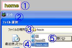 | 写真(5)は、「小目次と1ページ目の相互リンク(5)」画面です。 (1)@「home」が見えるように、 (2)A「リンク」ウィンドウ・「ファイル選択」ウィンドウを移動 (3)B「ファイルの場所」は「hosin」フォルダ→C「hosin_ndx」を選択→D「開く」→「OK」 | |||||||||||||||||||||||||||||||||||||||||||||||||||||||||||||||
